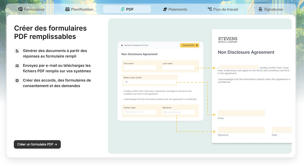 Que ce soit pour des formulaires de réservation (hôtel, restaurant), des inscriptions à des événements, des formulaires de paiement, des demandes de devis, sondages clients ou encore des documents PDF générés avec signature.